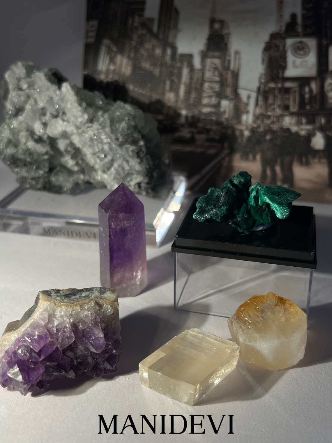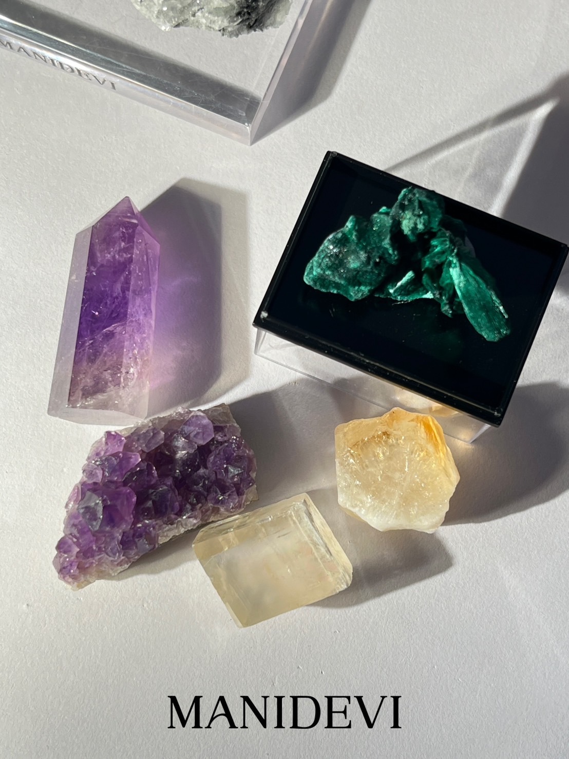 組合內容:綠絲絨孔雀、烏拉圭紫晶、冰州石、紫水晶柱、黃水晶柱。